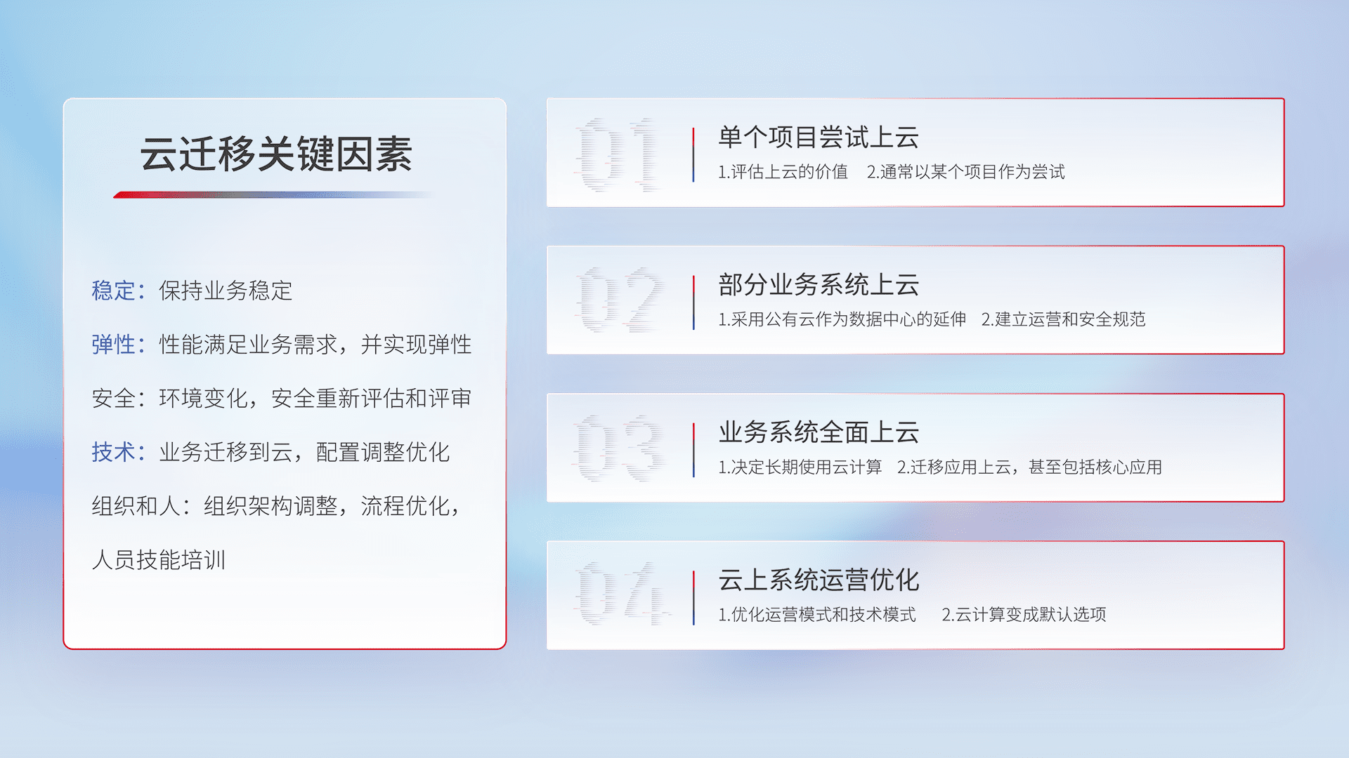 结合实际业务,,,,从规划设计、、云平台选型、、、云原生改造、、、、数据迁移、、、、集成交付,,,,迁移全过程为客户识别最佳上云路径,,,,做好风险识别管理,,,,设计网络架构、、、身份权限、、、安全审计合规、、操作审计、、、日志审计、、监控告警策略、、、多站点容灾设计等,,对云上基础设施进行整体规划,,,提升IT治理水平,,,以满足弹性、、高可用、、高性能的需求。。。。
