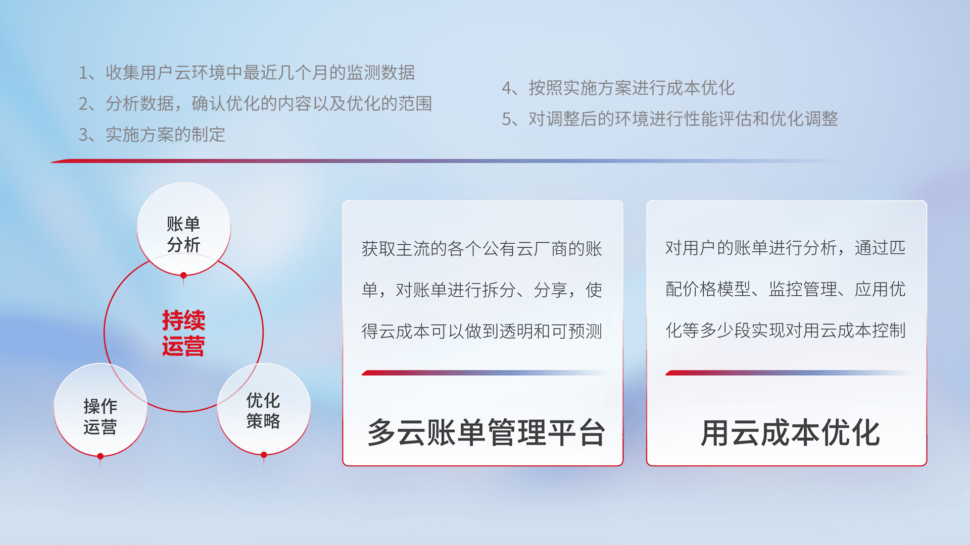 通过多云纳管,,以统一的资源数据模型把客户的云资源进行抽象和封装,,,,进而实现对多云资源的统一操作,,保障云资源管理的可靠性、、、、稳定性与可用性。。量身定制化运维内容,,,配置、、开发运维、、、、补丁管理、、备份、、、监控、、、认证和访问管理、、、审计和日常巡检等,,保障在用云过程中的可靠度,,稳定度以及高可用率。。。。